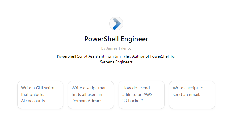 This is a custom GPT that is trained on my book, which allows you to write PowerShell code without having to preface each prompt with “Write a PowerShell script that…” Moreover, it allows you to focus in on some of the things I have focused in on in my book and YouTube videos, such as automating processes, making graphical PowerShell scripts with Windows forms, and interfacing with cloud platforms.