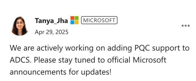 During the recent Microsoft Windows Server Summit Tanya Jha confirmed the AD product team is actively working on adding PQC support to ADCS. A formal announcement of details and timing is to come.
